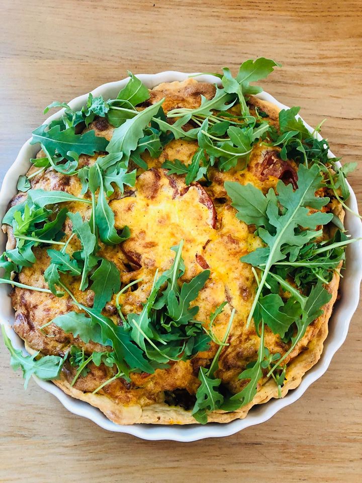 BBQ - tarta z prażonym, wędzonym boczkiem, pieczarkami BBQ, cebulką, serem cheddar, czerwoną papryką, pieczonymi ziemniakami, zapiekana pod masą śmietanowo-jajeczną