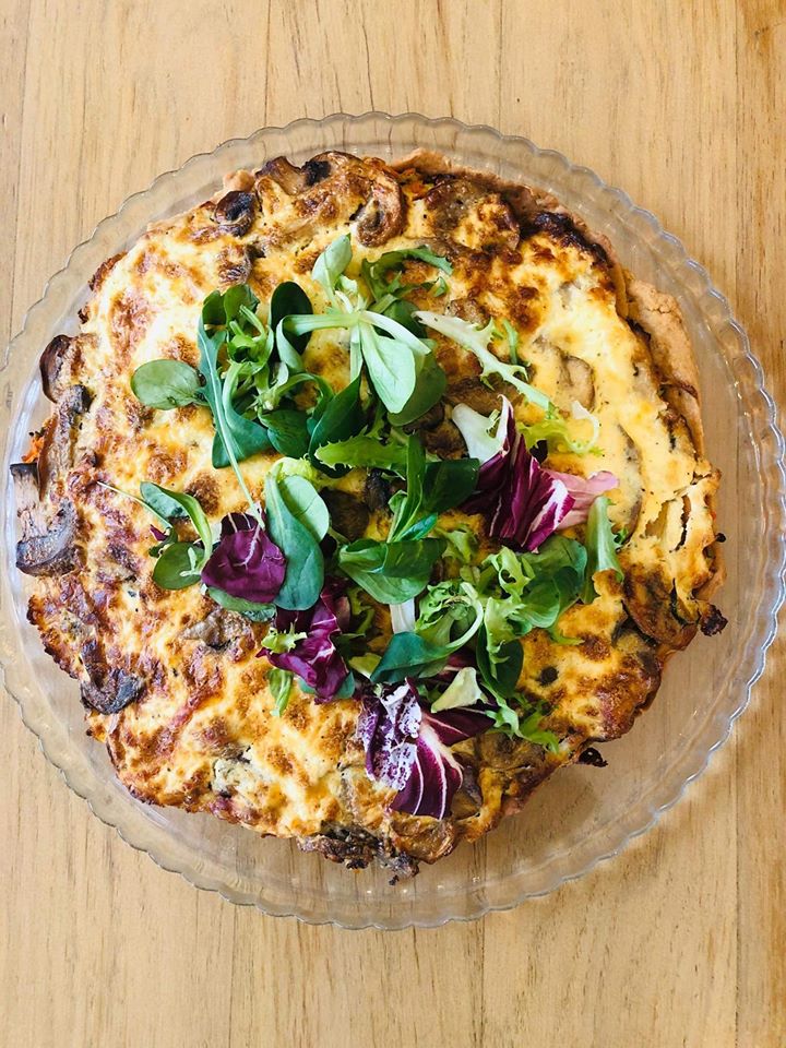 LEŚNA - tarta z kurkami, cebulką, szpinakiem, serem camembert, prażonymi płatkami migdałów, zapiekana pod masą śmietanowo-jajeczną